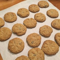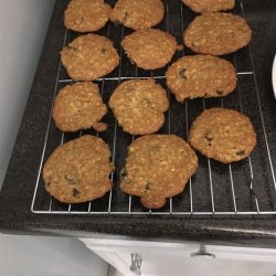 3In a large bowl, cream the butter, brown sugar, and white sugar together. Sift together the flour, cinnamon, and baking soda; stir into the creamed mixture. Then stir in the raisin mixture, rolled oats, and nuts.